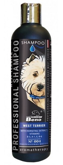 Profesjonalny szampon dla rasy psów West Terrier, skomponowany w oparciu o łagodne substancje myjące. Bogaty w naturalne składniki odżywcze pochodzenia roślinnego: ekstrakty z rumianku, żeń-szenia i skrzypu, glicerynę. Wzbogacony w hydrolizat keratyny, który głęboko regeneruje sierść psa, odbudowuje jej strukturę i sprawia, że włos staje się gładki i błyszczący. Dodatek rumianku rozjaśnia przebarwienia sprawiając, że sierść psa jest idealnie biała. Naturalne olejki macadami i z nasion bawełny wtórnie natłuszczają sierść, pH neutralne dla zwierząt.