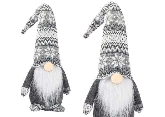 Szary krasnal świąteczny z szaro-białą czapką, którą można dowolnie formować dzięki drucikowi. Stabilnie stoi dzięki zrównoważonemu obciążeniu. Wykonany z miękkiego, przyjemnego w dotyku materiału. Wymiary 40cm x 16cm.